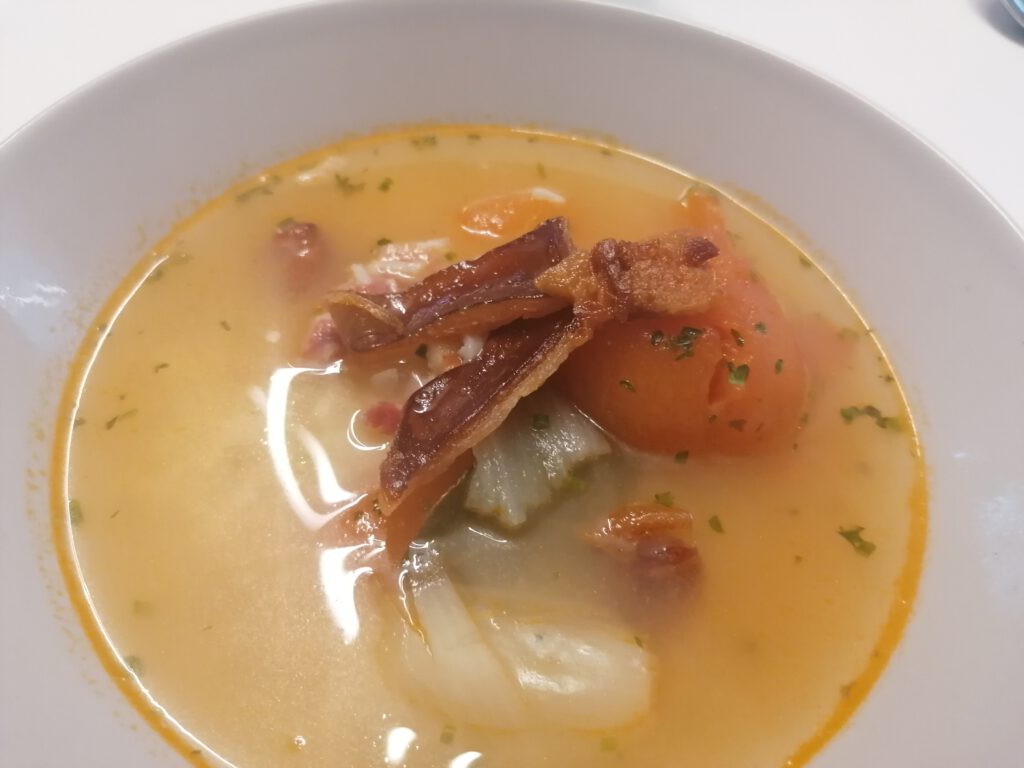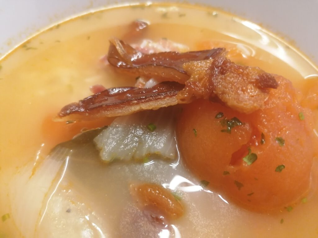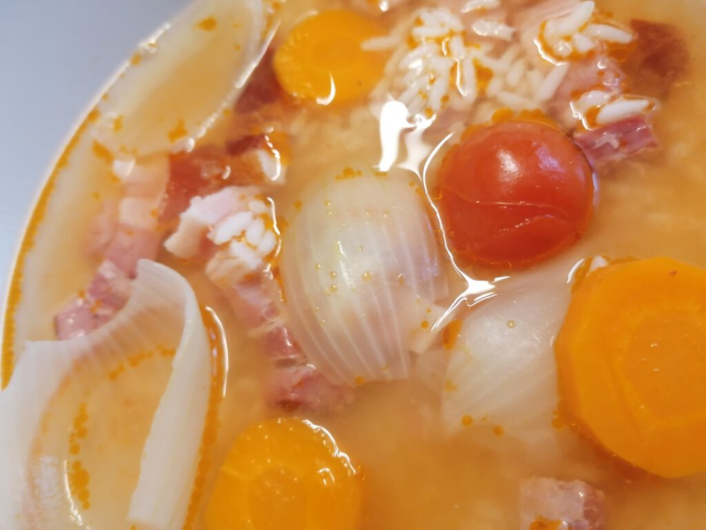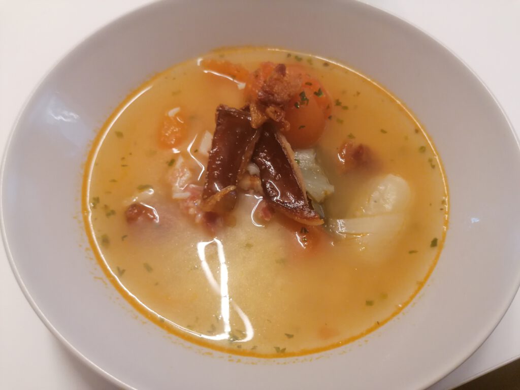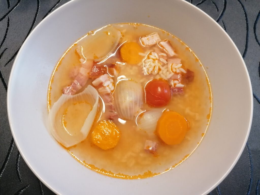 Ein Arme-Leute-Essen – und dennoch sowas von lecker. Ein „altes Familienrezept“: Die Dörrfleisch-Suppe. Dazu wird Dörrfleisch mit Tomaten, Möhren, Zwiebeln, Lorbeer gekocht, als Einlage Reis dazu… Schnell zubereitet und echt lecker