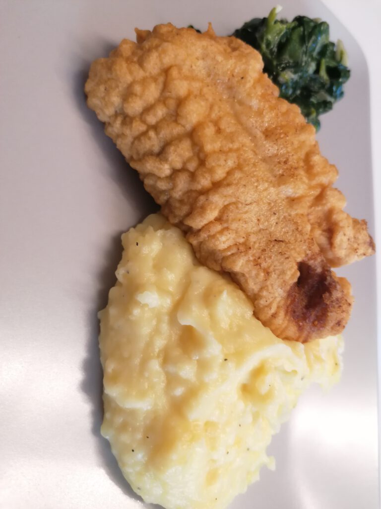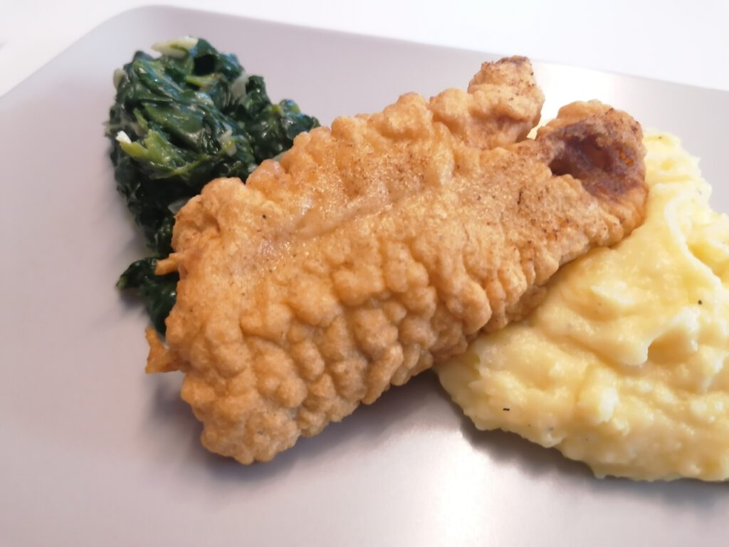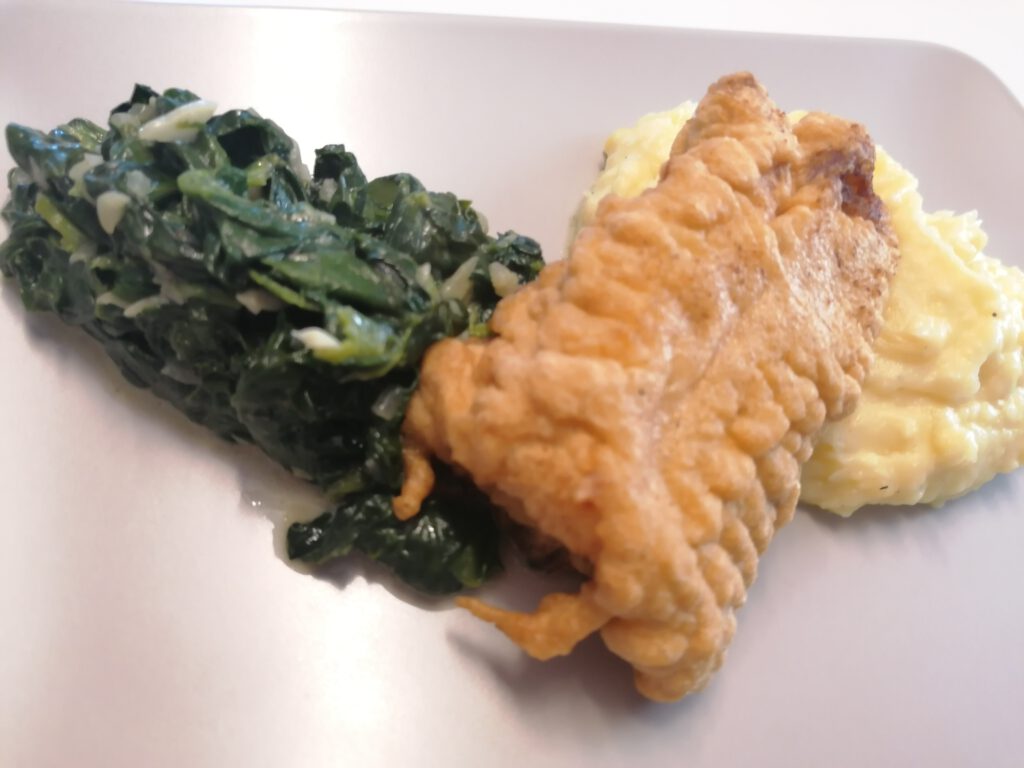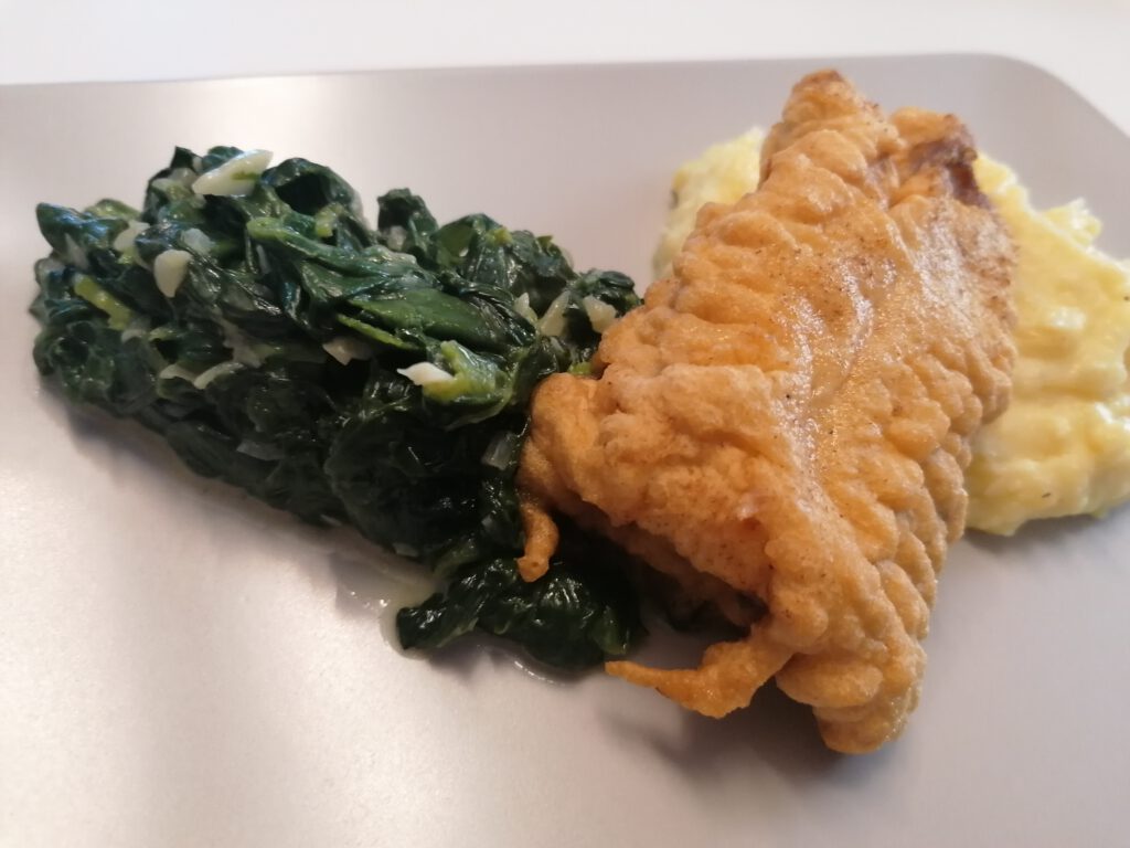 Leckeres Seelachsfilet im Bierteig ausgebacken, dazu Kartoffelstampf und frischer Blattspinat. Das essen sogar die Kids gerne!