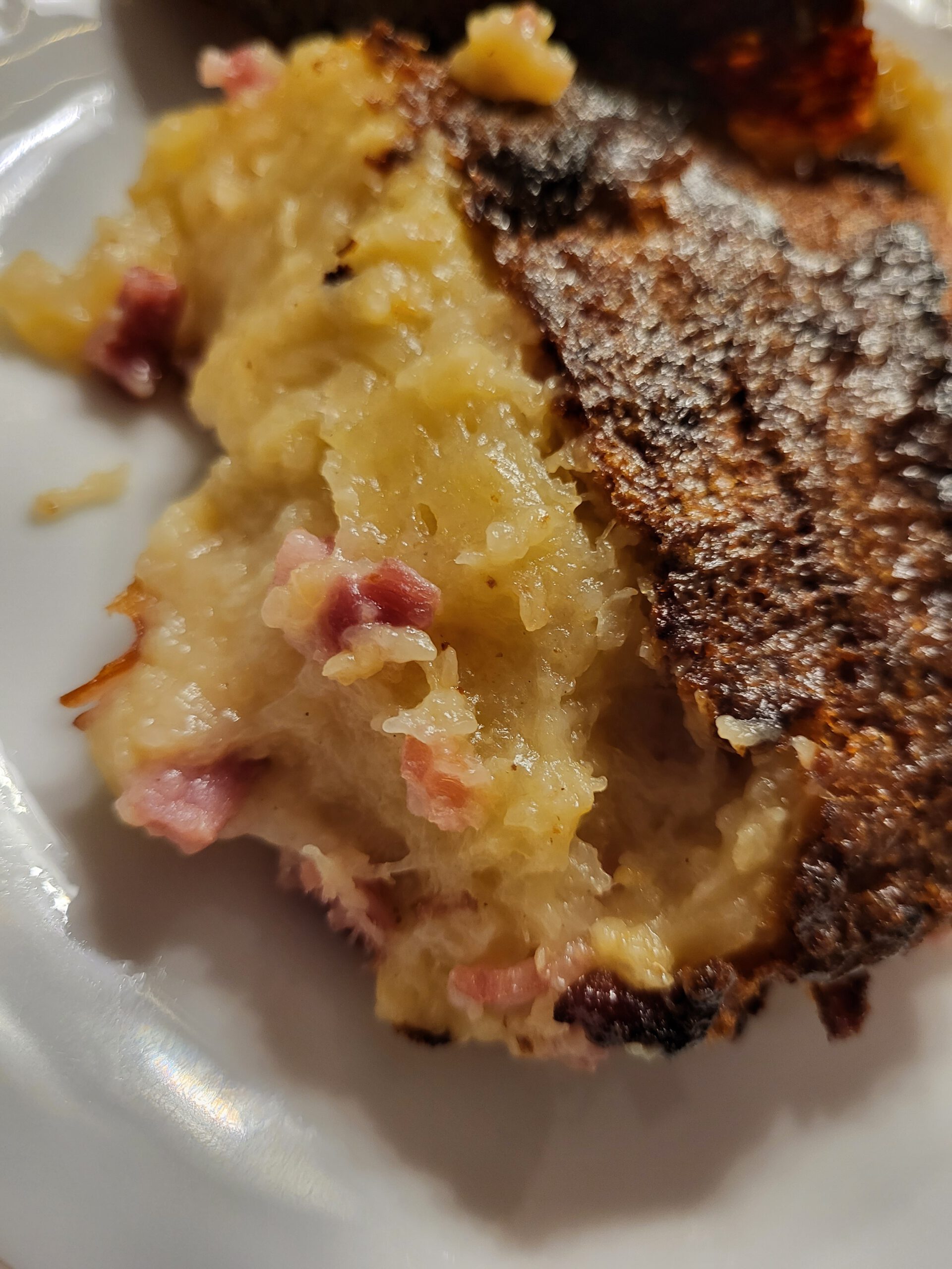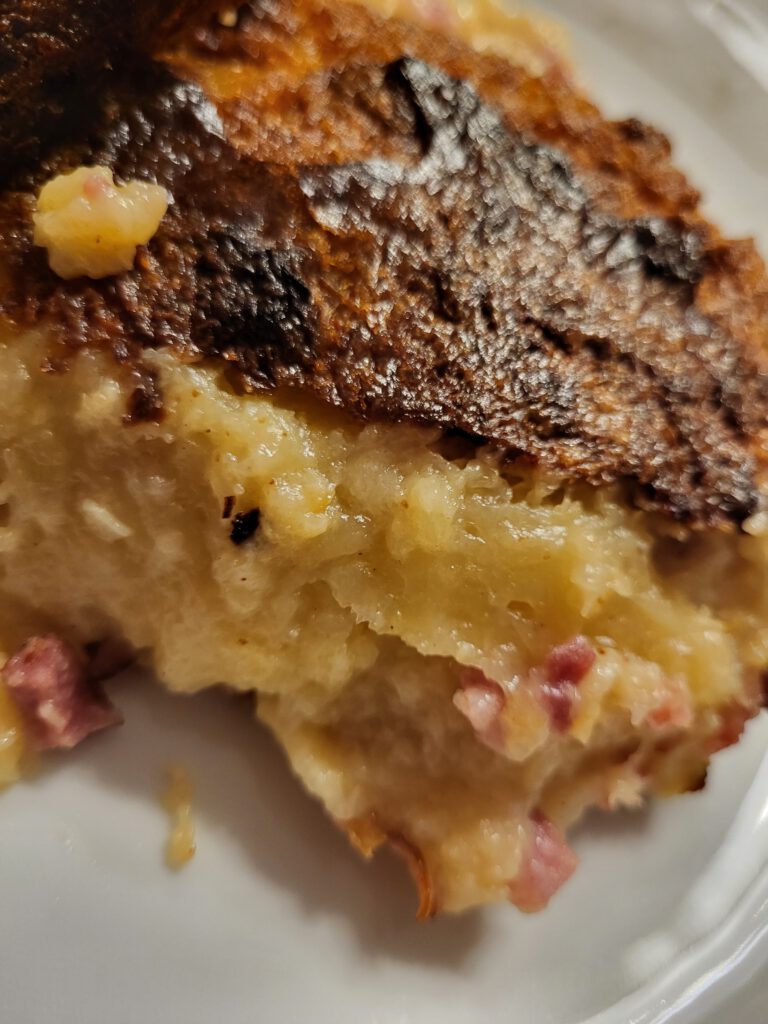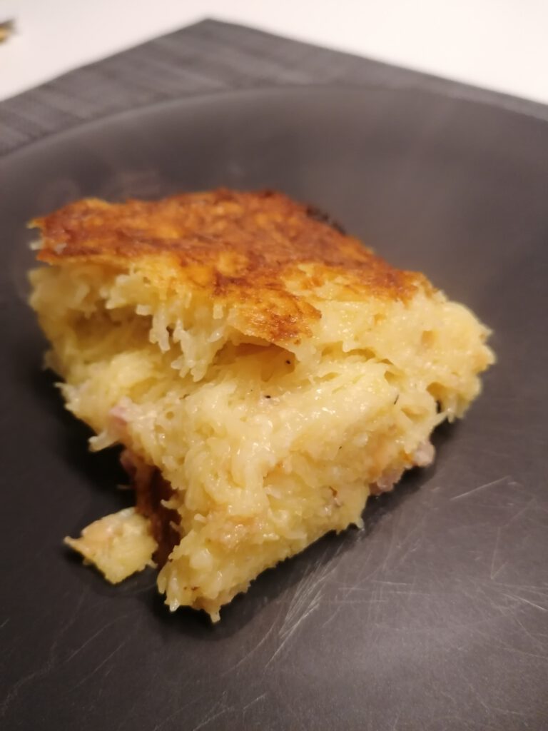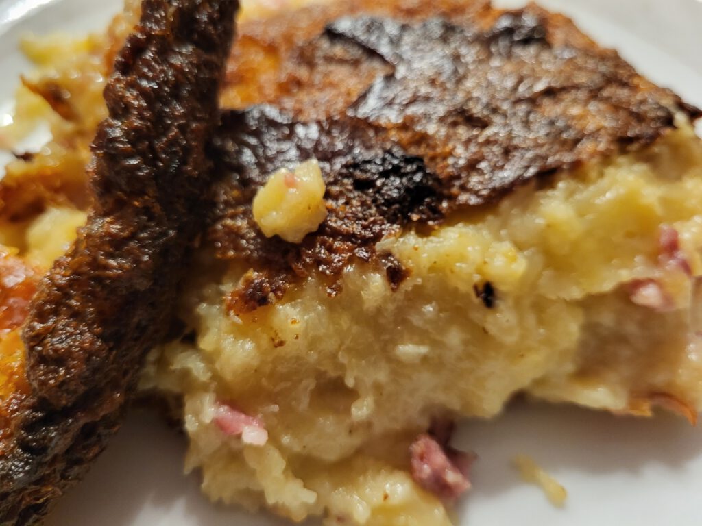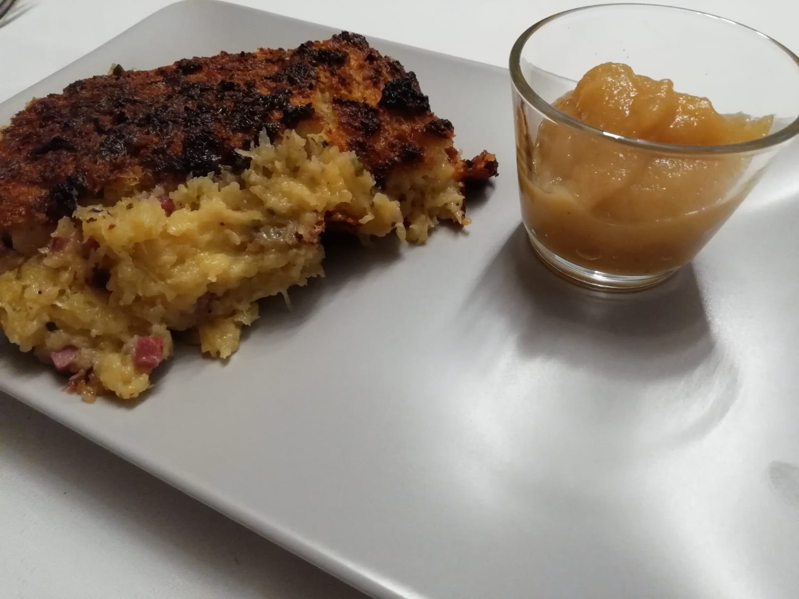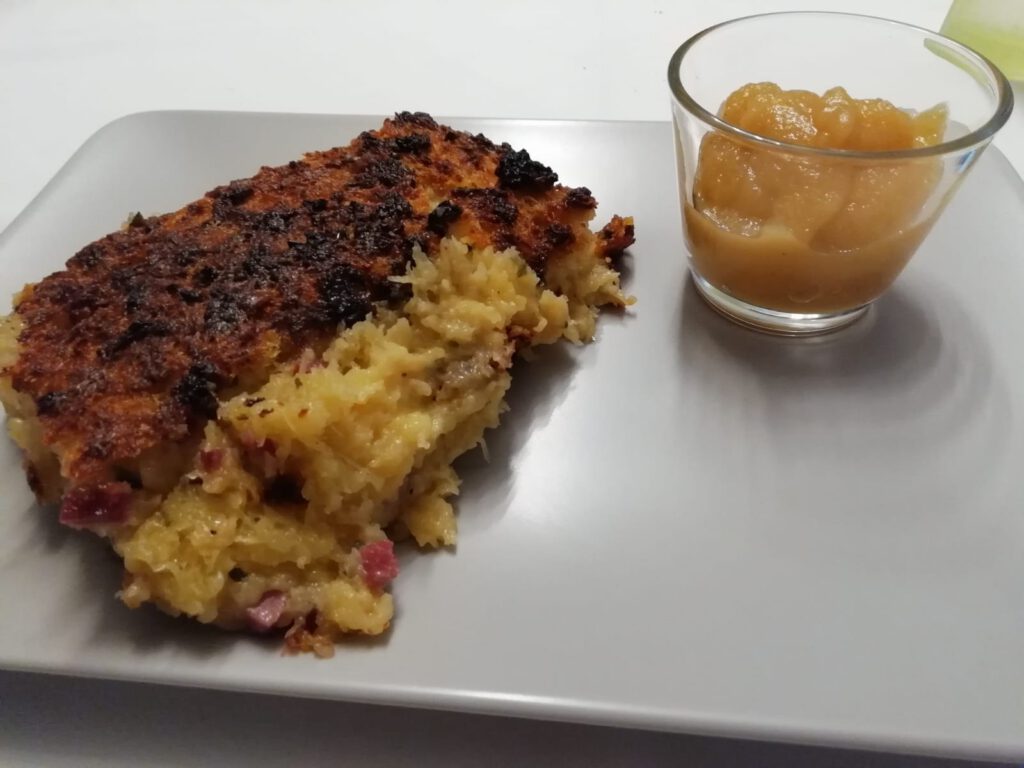 Leider gerieten solche „Bauernkost“ oder „Hausmannskost“ etwas in den Hintergrund – mittlerweile wird sie jedoch langsam wiederentdeckt. So habe ich beispielsweise eine Interpretation des „Dibbekuchen“ in einem prämierten Restaurant als „kartoffel-Topfküchlein im Glas“ mit gebratener Jakobsmuschel erlebt… Dennoch: So einfach und bodenständig, da muss nicht viel TammTamm und SchiSchi drumherum gemacht werden. Ehrlich, leckere Küche – und dabei oft auch nachhaltig, da regional und saisional! Probiert´s aus! Am besten mit hausgemachtem Äbbelschmer (Apfelkompott).